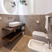 A destra si trova la zona lavanderia con lavatrive e i due bagni, entrambi dotati di doccia.